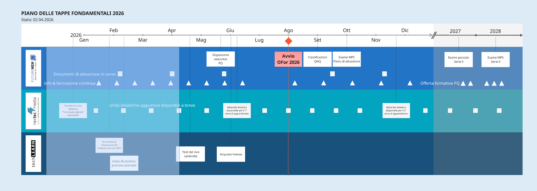 I tre ambiti FUTUREMEM, techLEARN e nextecmedia sono strettamente collegati e coordinati tra loro. La seguente panoramica delle tappe fondamentali mostra lo stato attuale degli oggetti di fornitura disponibili nel 2026. L’elenco verrà aggiornato continuamente.
